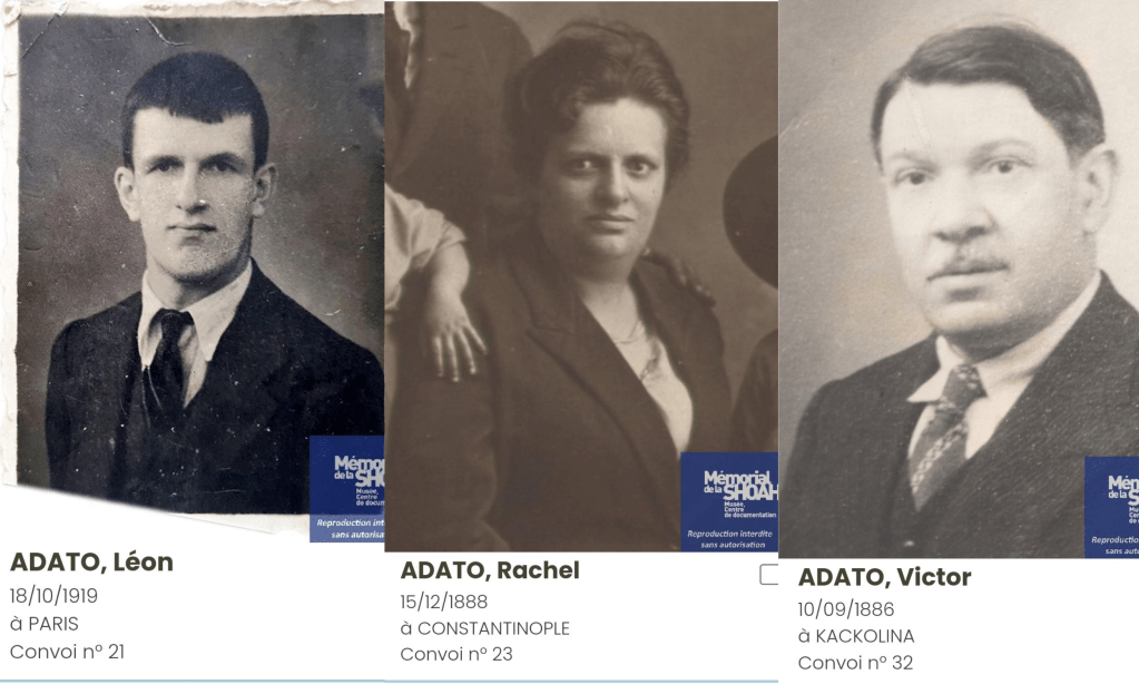En parallèle de mes recherches, j’ai commencé à confier des documents au Mémorial de la Shoah – un carnet de route, une lettre, un dessin de ma grand-mère cachée au couvent… – et trois photos. Trois visages qui sont désormais en ligne sur les fiches de Léon, Rachel et Victor Adato. Trois Français dénaturalisés et assassinés parce que juifs qui, après avoir été inscrits sur le Mur des Noms, trouvent une place sur ce Mur de Visages.